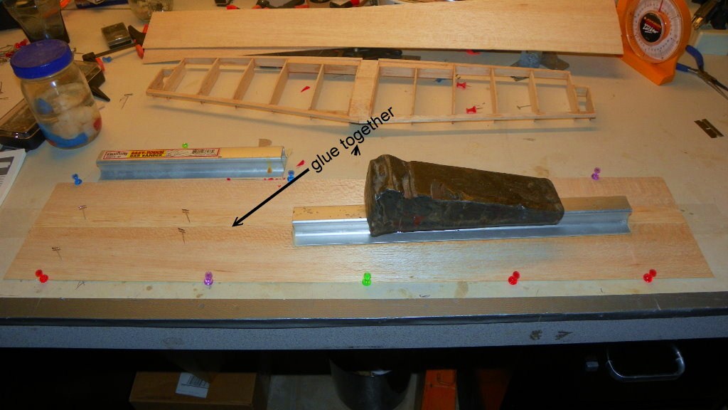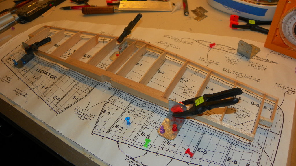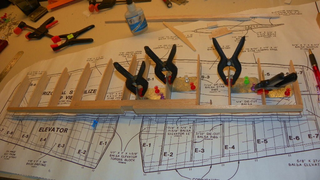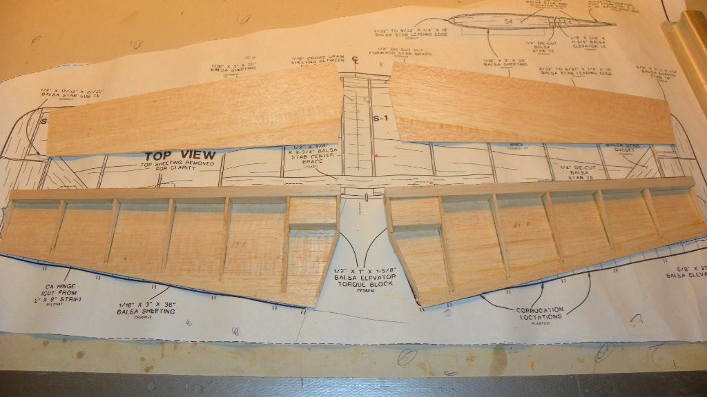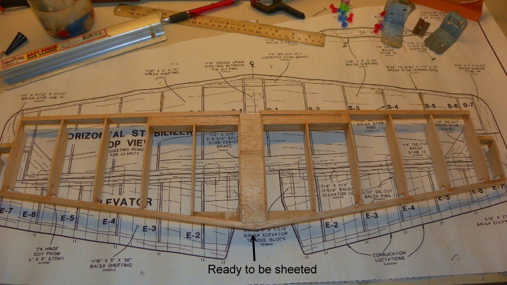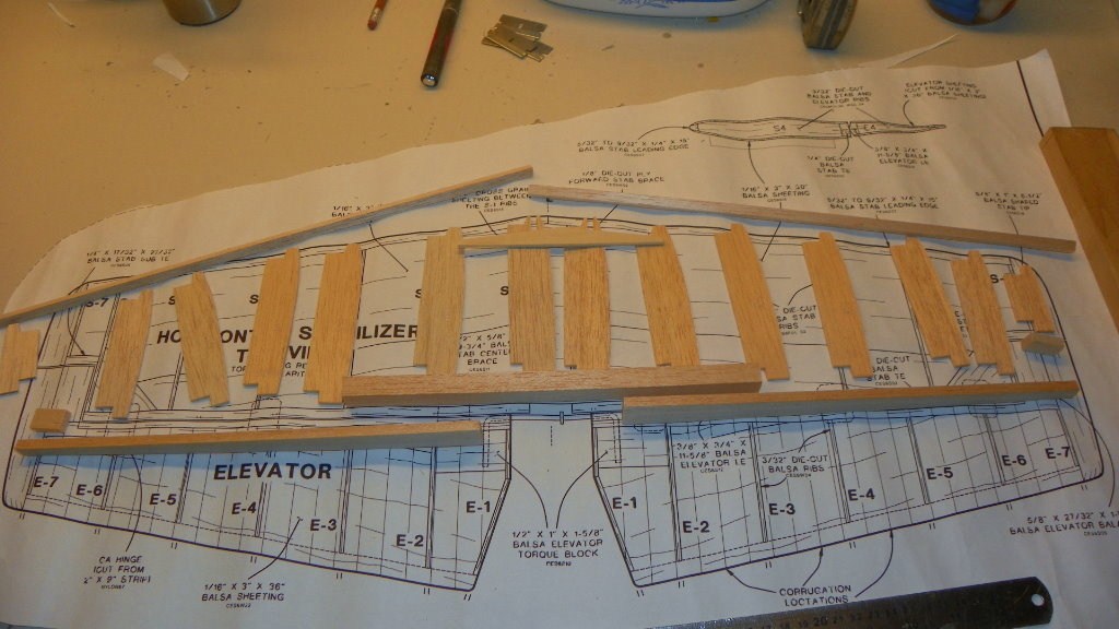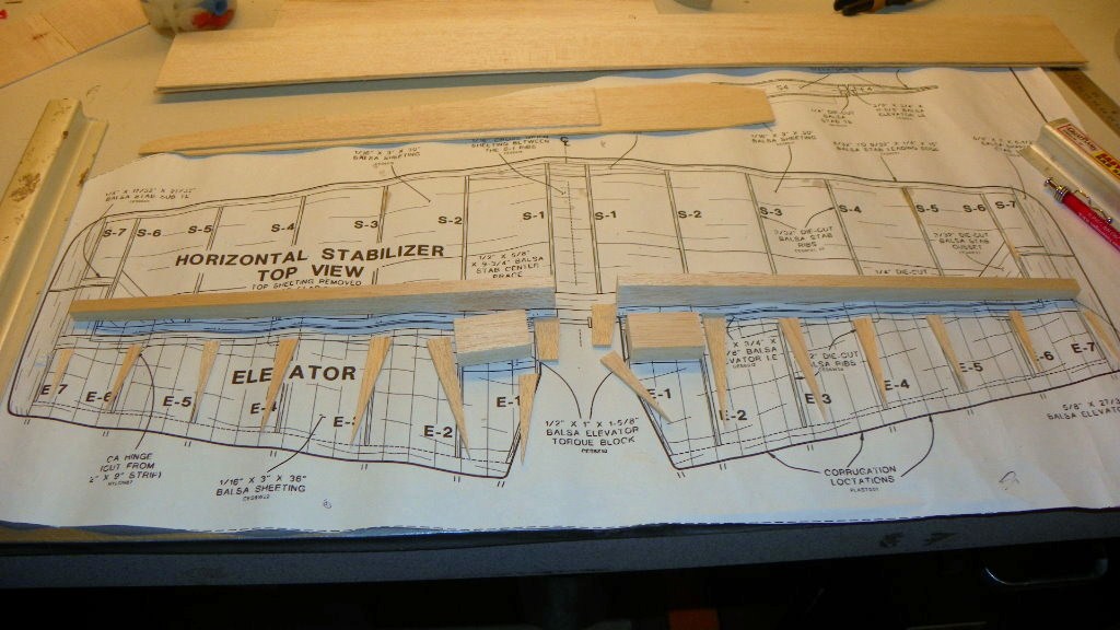 I got started on the stabilizer.It has a lot of parts.It went together fairly good. It's ready to start sheeting. First I have to glue two sheets of balsa together. I hope it is easier to sheet than the fuse.