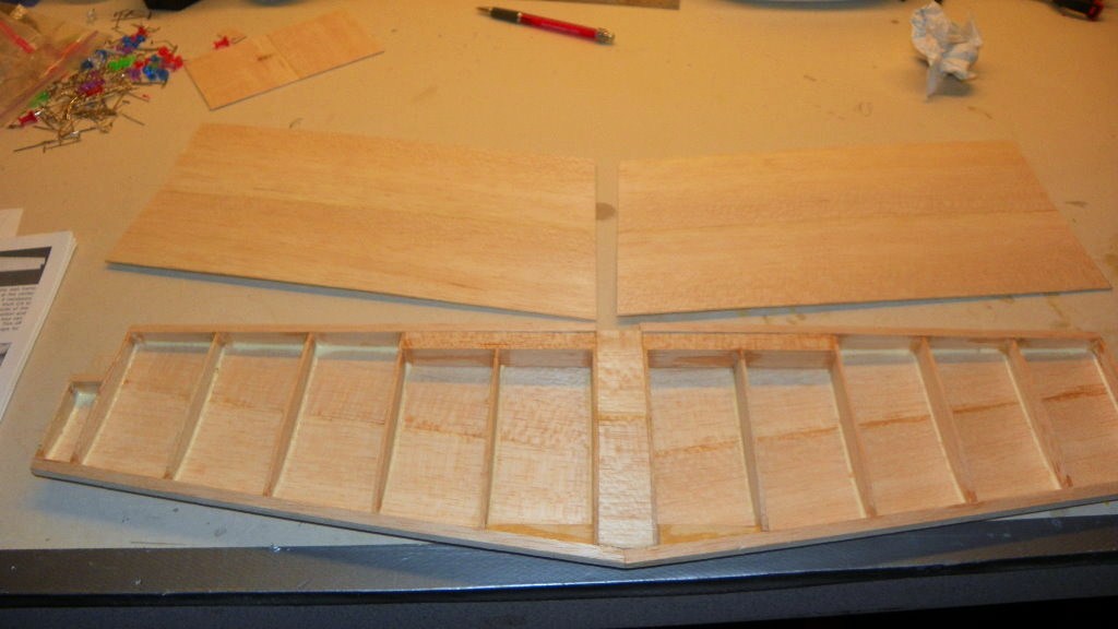 I got one side of the Stabilizer done. While it's gluing. I started on the Elevator.I must have a long ways to go , because I still have a box full of wood. Anyway ,Here is some of the latest pictures.